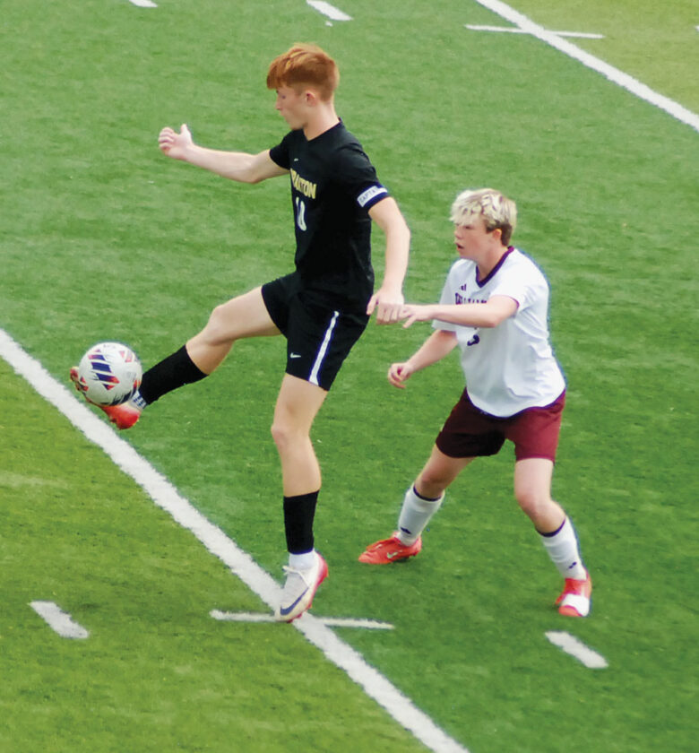 - Braxton County’s Zack McQuain settles the ball in front of Williamstown’s Colten Rinard during the Eagles’ 6-0 Little Kanawha Conference championship match victory Saturday at Bill Hanlin Stadium in St. Marys. (Photo by Jay W. Bennett)