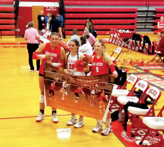 Parkersburg High School libero Brenan Harvey, middle, poses with fellow seniors Kennedy Porter, left, and Ava Sayre to celebrate her 1,000th career dig Thursday evening inside Memorial Fieldhouse. (Photo by Jay W. Bennett)
