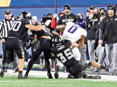 WVU linebacker Reid Carrico (35) brings down a TCU ballcarrier during last Saturday’s game in Morgantown. (Photo by David Pennock)