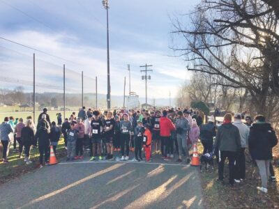 - Runners stand at the starting line for last year’s Devola Turkey Trot 5K fun race. (Photo provided by Tyler Sprigg)