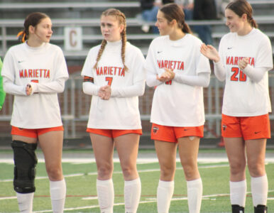 - CAPTAINS: The four Marietta captains, from left, Caroline Cortopassi, Izzy Riggs, Averi Kendall and Lauren Elliott are introduced during the pregame of Saturday’s Ohio Division III regional final against Akron Archbishop Hoban in Dover. (Photo by Kerry Patrick)