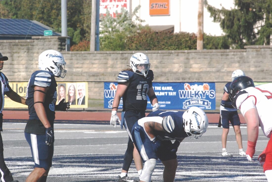 Marietta College linebacker Harley Hopkins (10) lines up prior to a snap during a game against Muskingum this season at Don Drumm Stadium. (Photo by Jordan Holland)