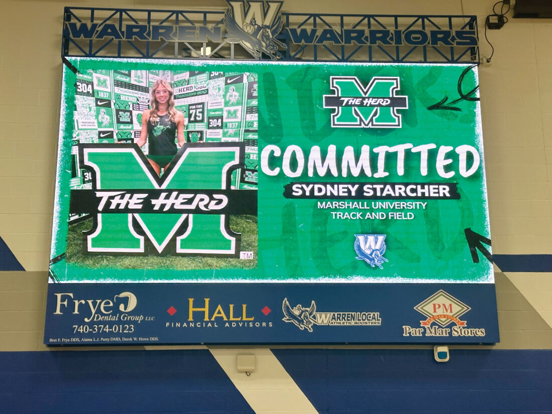 - Warren High School senior Sydney Starcher’s signing day with Marshall University is shown on the scoreboard inside Warrior Coliseum. (Photo by Kerry Patrick)