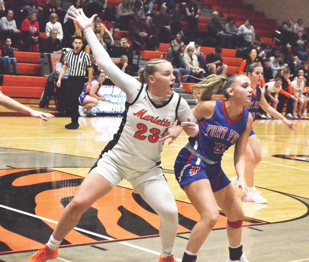 - Fort Frye’s Elle Casto, right, defends Marietta’s Braxtyn Kroft in the paint during Monday’s game at Sutton Gym. (Photo by Mike Morrison)