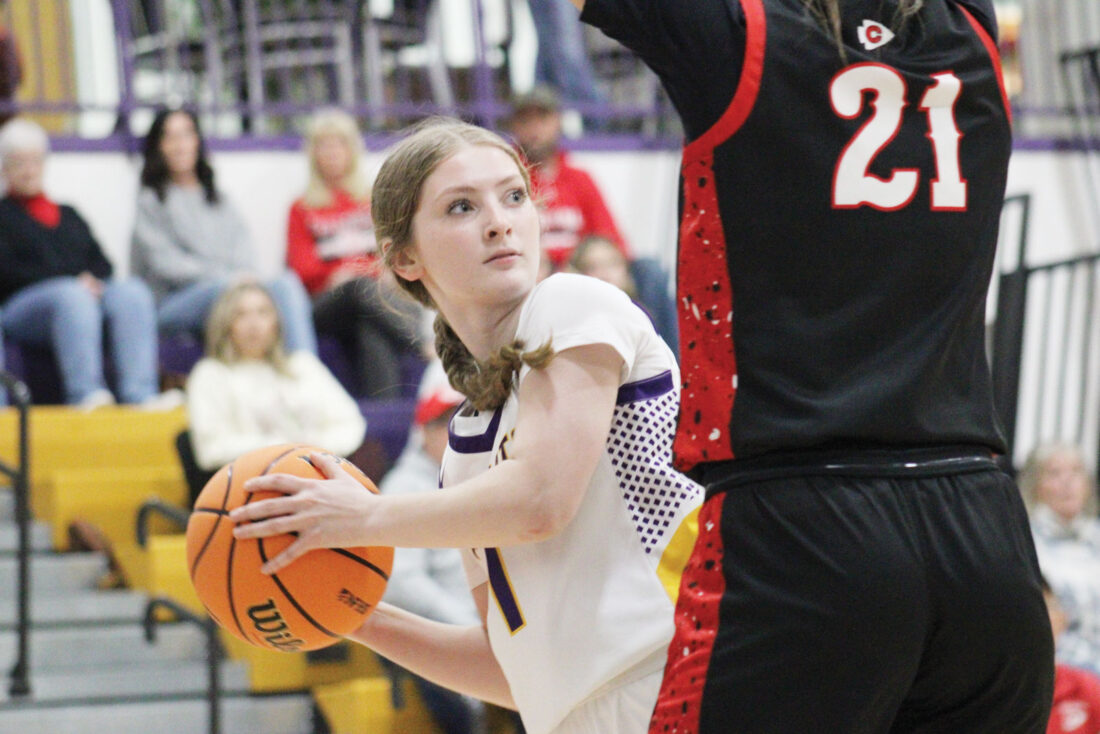 - Wood County Christian’s Ellie Piatt (3) is defended by Caldwell’s Laynie Sidwell during Thursday’s game at Wood County Christian High School. (Photo by Kerry Patrick)