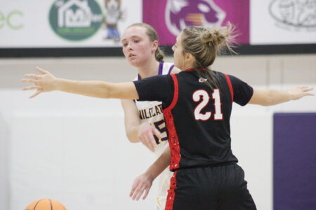 - Wood County Christian’s Hannah Parsley (1) gets her path toward the basket cut off by Caldwell’s Lyla Lowe (21) during Thursday’s game at Wood County Christian High School. (Photo by Kerry Patrick)
