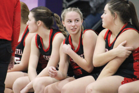- Caldwell’s Breighlee Moracco talks to a teammate on the bench while taking a break during Thursday’s game against Wood County Christian played in Williamstown.(Photo by Kerry Patrick)
