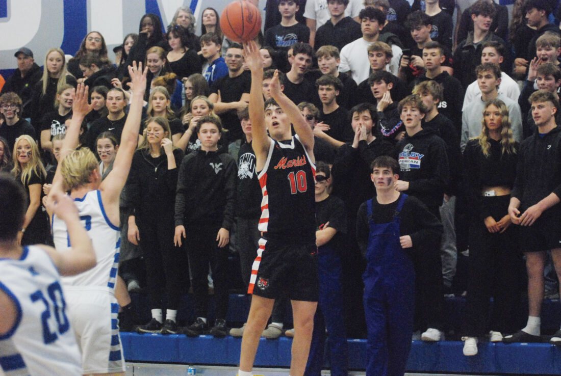 - Marietta’s Logan Grosklos (10) knocks down a 3-pointer during Friday’s game against Warren in Vincent. (Photo by Jordan Holland)