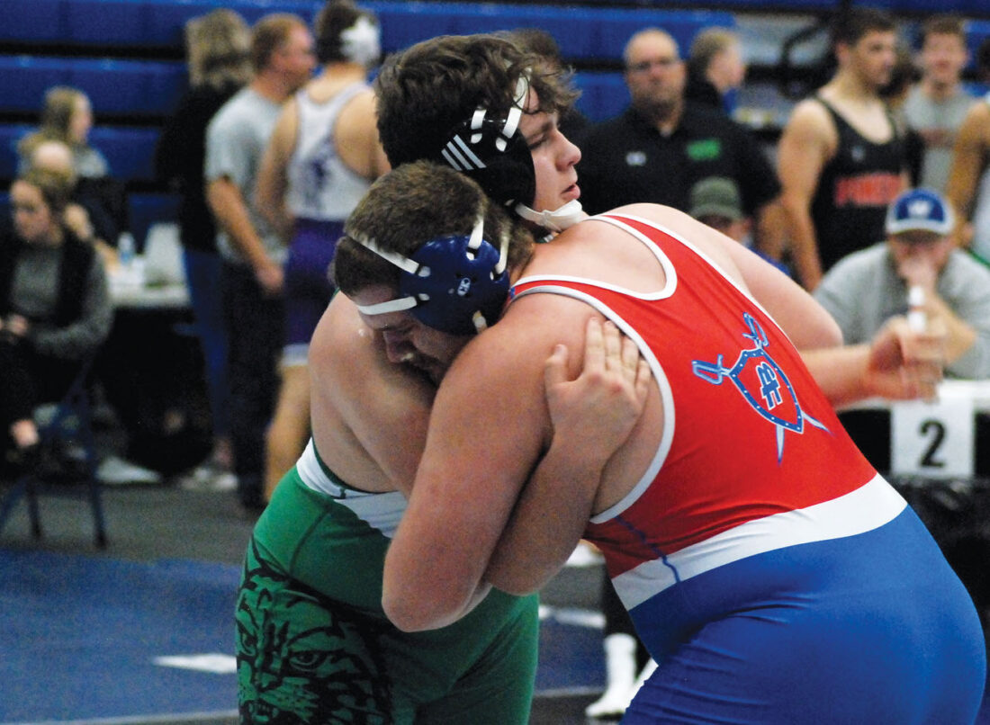 - Waterford’s Cadon Riley and Fort Frye’s Steven Lenhart battle during a heavyweight match at Saturday’s Hickory Grove Market Invitational. (Photo by Jay W. Bennett)