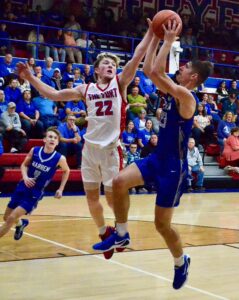 Warren’s Blake Grimes (23) goes up for a shot as Fort Frye’s Grady Hesson (22) contests during Tuesday’s game in Beverly. (Photo by Mike Morrison)