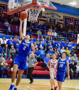 Warren’s Jackson Perdue (2) goes up for a layup against Fort Frye during Tuesday’s game in Beverly. (Photo by Mike Morrison)