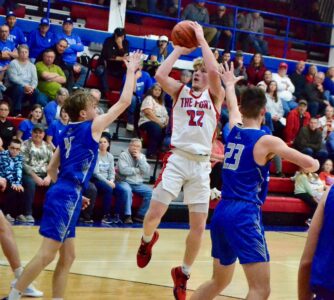 - Fort Frye’s Grady Hesson (22) goes up for a jumper as Warren’s Liam Grosselin (4) and Blake Grimes (23) contest during Tuesday’s game in Beverly. (Photo by Mike Morrison)