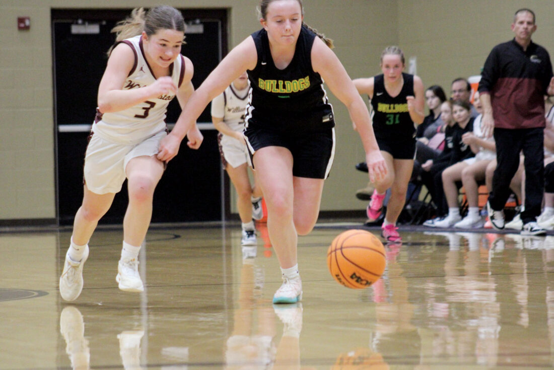 - Doddridge County’s Kamryn Satterfield, right, and Williamstown’s Quinn Bunch (3) track down a loose ball during Monday’s game in Williamstown. (Photo by Kerry Patrick)