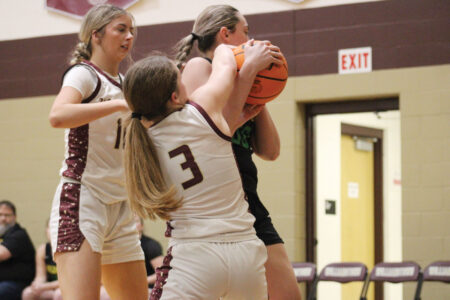 - Williamstown’s Quinn Bunch (3) tries to pry a rebound away from Doddridge County’s Isabella Holtz during Monday’s game in Williamstown. (Photo by Kerry Patrick)