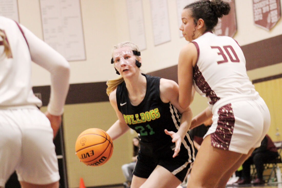 Doddridge County’s Brooke DeHaven (21) looks to drive past Williamstown’s Arissa Burt during Monday’s game in Williamstown. (Photo by Kerry Patrick)