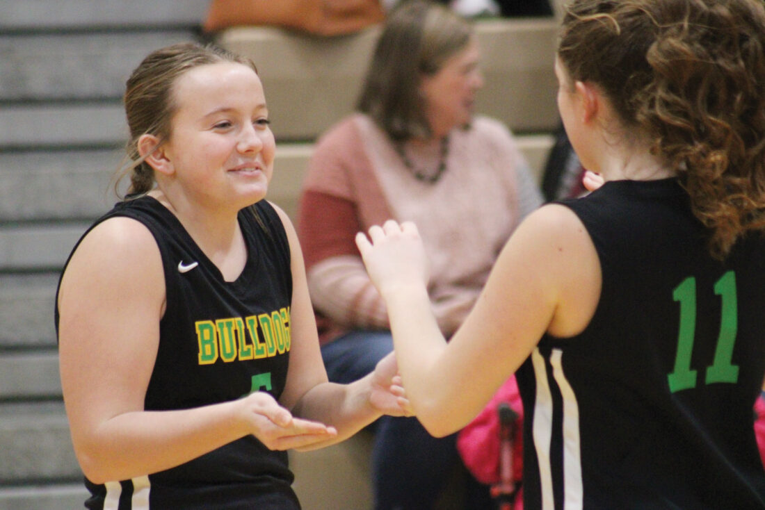 - Doddridge County’s Kamryn Satterfield, left, welcomes a teammate onto the court during pregame introductions prior to Monday’s game with Williamstown. (Photo by Kerry Patrick)