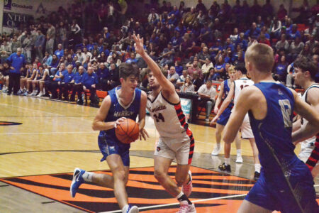 - Marietta’s Zaiden Wittekind (20) finishes a thundering two-handed duck while a trio of Warren Warriors look on. Wittekind scored 27 points Monday as the Tigers downed Warren 75-66 at Sutton Gym. (Photo by Mike Morrison)