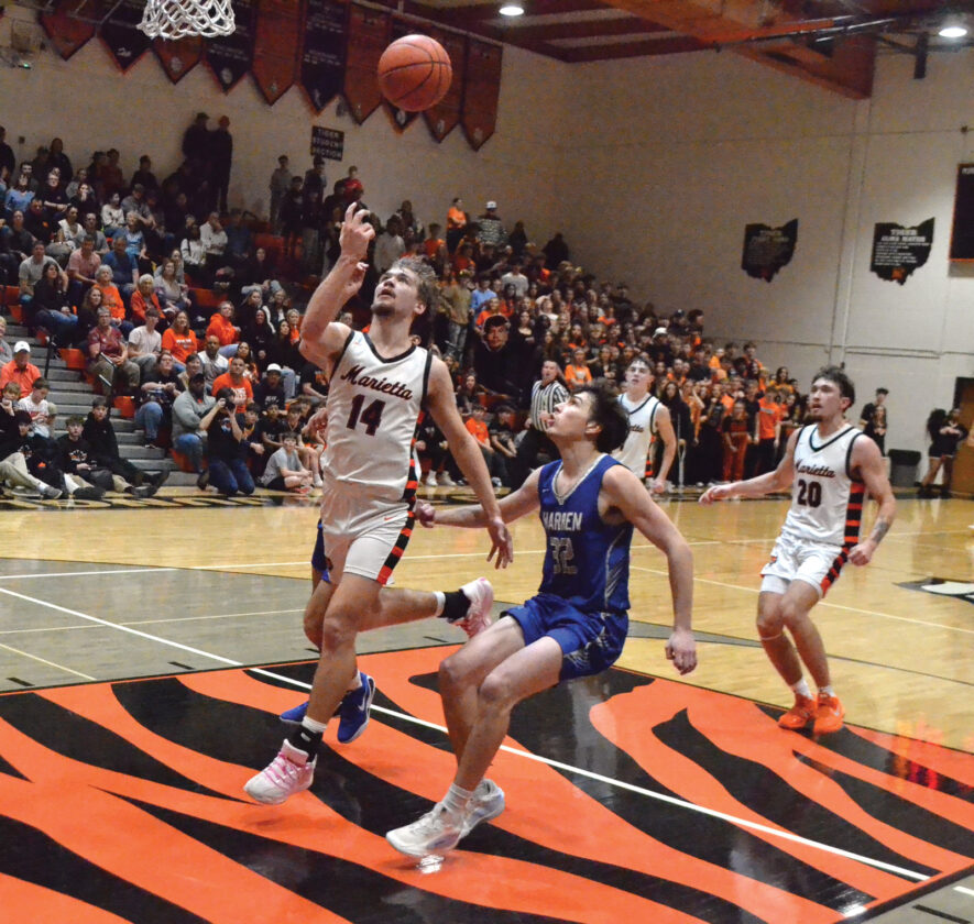 - Marietta’s Owen Riley(14) puts up a floater while Warren’s Caleb Tulius (32) defends. Riley scored 32 points in the Tigers 75-66 win over the Warriors Monday night at Sutton Gym. (Photo by Mike Morrison)
