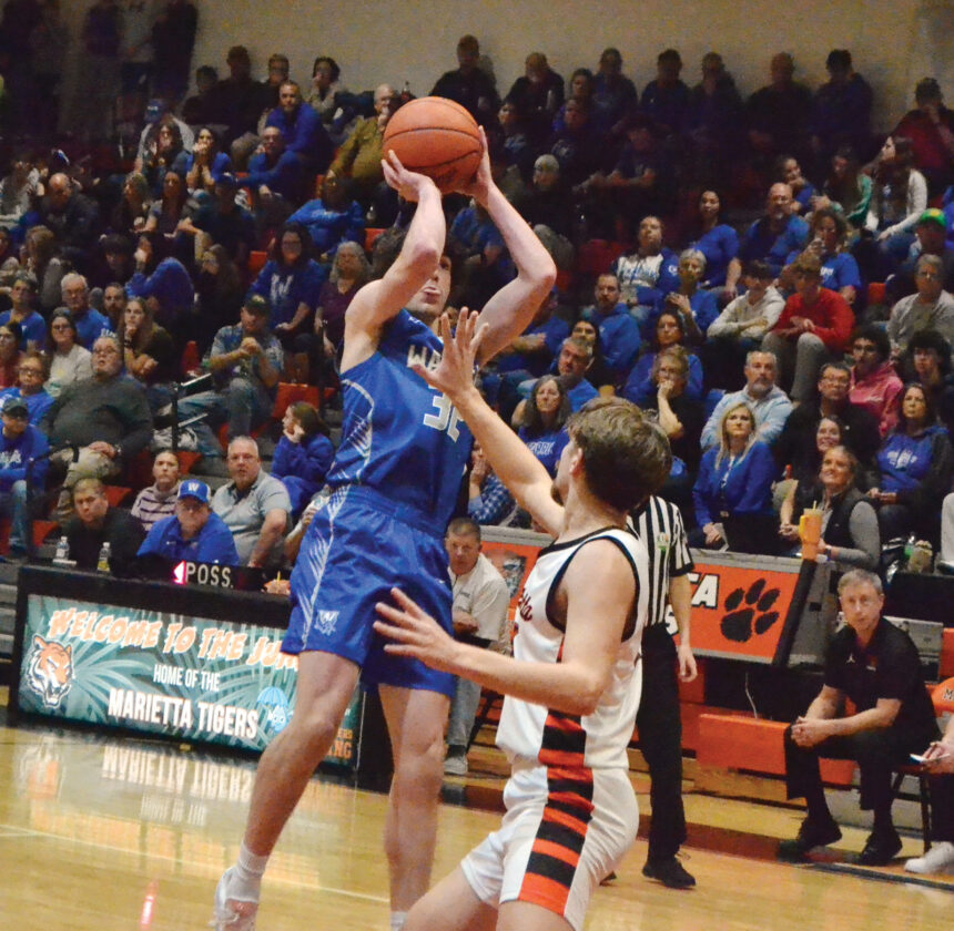 Warren’s Caleb Tulius (32) shoots a fade away jump-shot while Marietta’s Owen Riley (14) defends Monday night at Sutton Gym. (Photo by Mike Morrison)