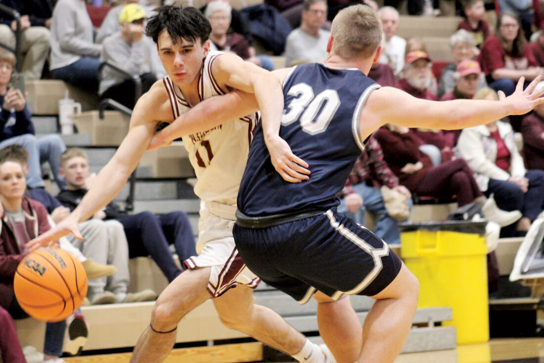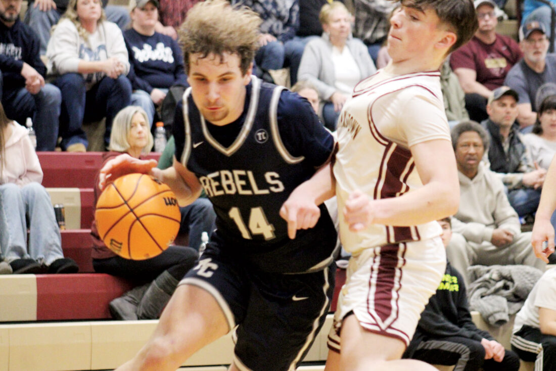 - Ritchie County’s Isaac Hodges (14) drives baseline while being guarded by Williamstown’s Dom Strcula during Wednesday’s game in Williamstown. (Photo by Kerry Patrick)