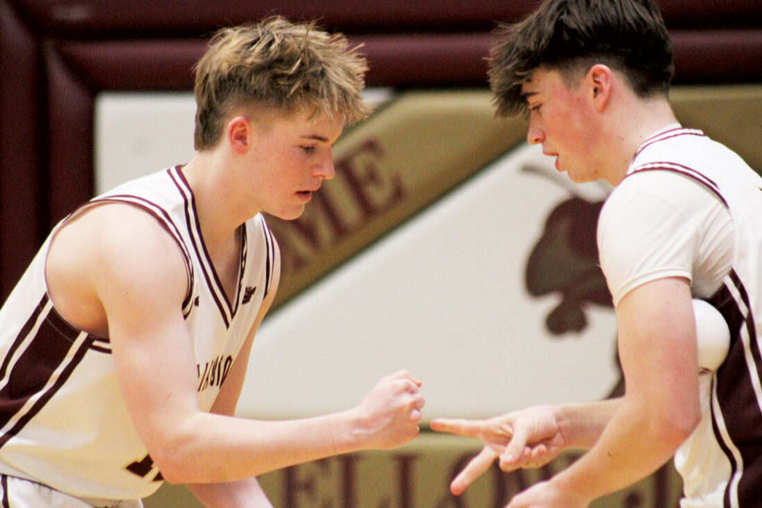 - Williamstown’s Mason Kern, left, greets teammate Dom Strcula during player introduction prior to Wednesday’s game against Ritchie County at Williamstown High School. (Photo by Kerry Patrick)