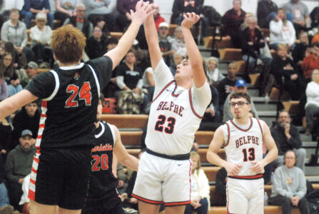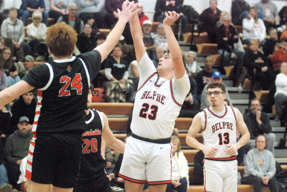 Belpre’s Carson Woodford (23) follows through on a jumper as Marietta’s Braiden Plaugher (24) contests during Tuesday’s game at Joe Garrett Court. (Photo by Jordan Holland)