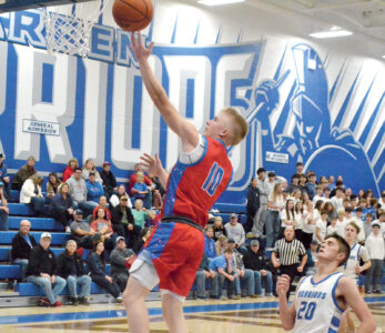 - Fort Frye’s Wyatt Duskey (10) goes up for a layup during Thursday’s game against Warren in Vincent. (Photo by Mike Morrison)