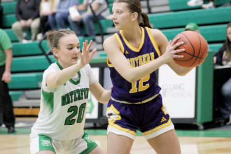 - Waterford’s Kayla Schwendeman (14) zeroes in on Southern ballhandler Neveah Camp (2) during Thursday’s game in Waterford. (Photo by Kerry Patrick)