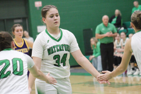 - Waterford’s Shaeli Hayes (34) receives handshakes from her teammates after a made free throw during Thursday’s game against Southern in Waterford. (Photo by Kerry Patrick)