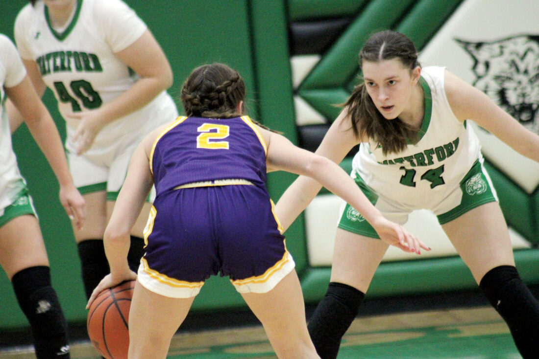 Waterford’s Kayla Schwendeman (14) zeroes in on Southern ballhandler Neveah Camp (2) during Thursday’s game in Waterford. (Photo by Kerry Patrick)