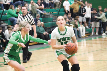 On the next sequence, Waterford’s Brynnlee Pottmeyer made a nifty pass around the hip of her defender to Gracie Hartline for an easy lay-in to change lead for the ninth and final time at 48-47.