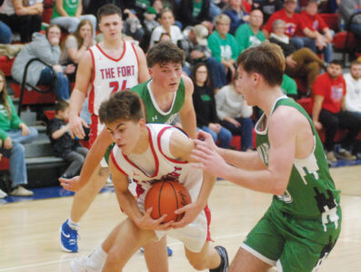 - Fort Frye’s Caden Henniger, center, drives the lane as Waterford’s Weston Fairchild, left, and Finn Pennock defend during Saturday’s game at Dan Liedtke Court. (Photo by Jordan Holland)