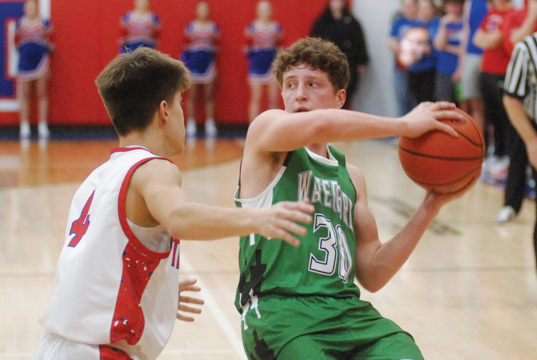 Waterford's Avery Pottmeyer (30) looks to pass as Fort Frye's Caden Henniger defends during Saturday's game at Dan Liedtke Court. (Photo by Jordan Holland)