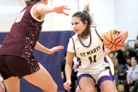 St. Marys’ Laney Watkins (11) dribbles along the perimeter during Tuesday’s game against Williamstown. (Photos by Kerry Patrick)
