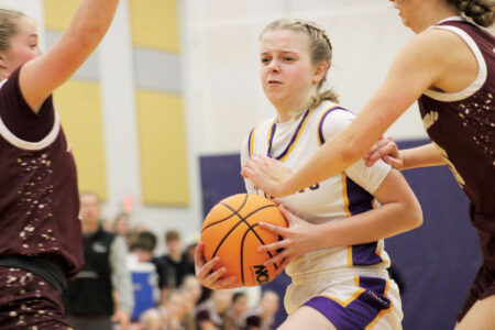- St. Marys’ Landrey Riggs drives between two Williamstown defenders, Tuesday night in St. Marys. (Photos by Kerry Patrick)