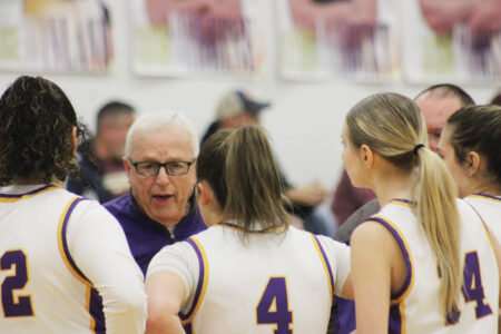 - St. Marys girls basketball coach Fred King talks to his players during a timeout from Tuesday’s Game against Williamstown. (Photos by Kerry Patrick)