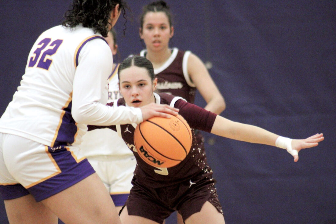 - St. Marys’ Laney Watkins (11) dribbles along the perimeter during Tuesday’s game against Williamstown. (Photos by Kerry Patrick)