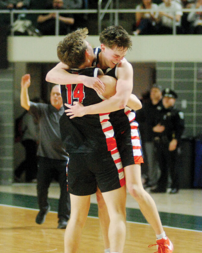 - Marietta’s Owen Riley (14) and Lucas Miller celebrate after the Tigers’ 55-52 win over Miami Trace in the district semifinals Friday at the Convo. (Photo by Jordan Holland)