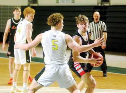 - Marietta’s Owen Riley, right, makes a move with the ball as Miami Trace’s Julian Baker (5) defends during Friday’s district semifinal matchup at the Convo. (Photo by Jordan Holland)