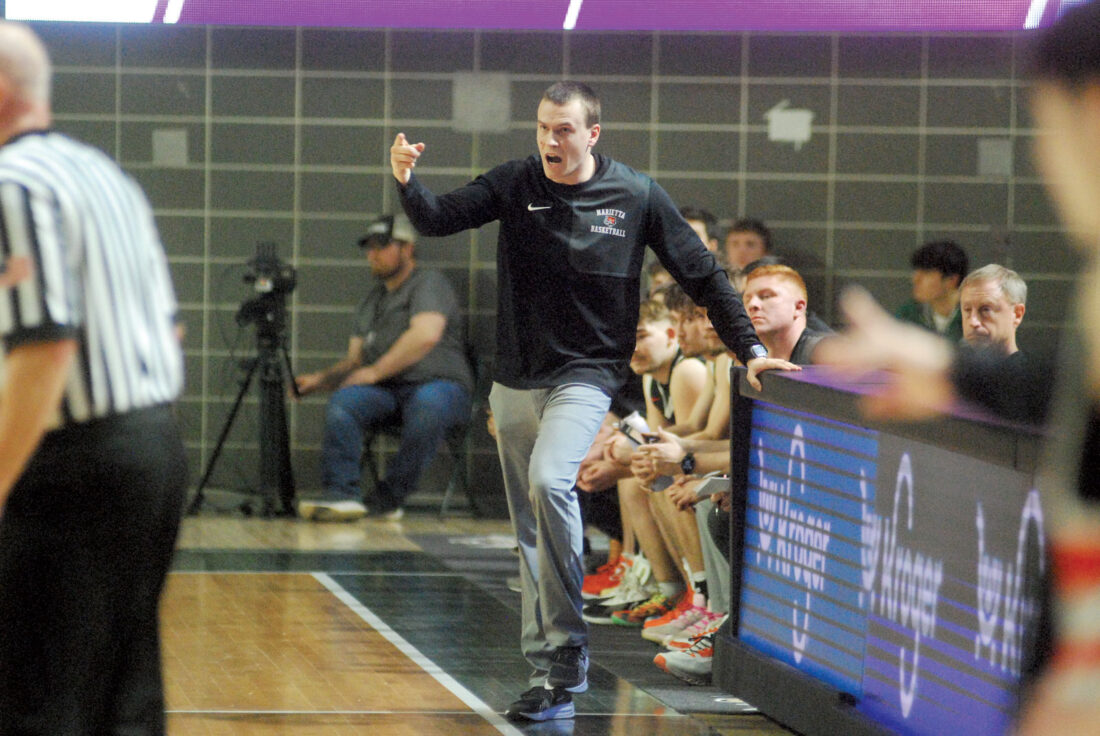- Marietta head coach Austin Gardner calls out a play during the Tigers’ 55-52 win over Miami Trace in the district semifinals Friday at the Convo. (Photo by Jordan Holland)