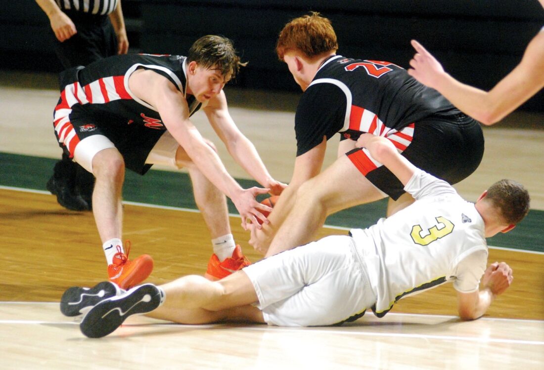 - Marietta’s Braiden Plaugher (24) and Trey Hawkins battle with Miami Trace’s Evan Parsley (3) for a loose ball during Friday’s district semifinal matchup at the Convo. (Photo by Jordan Holland)