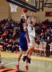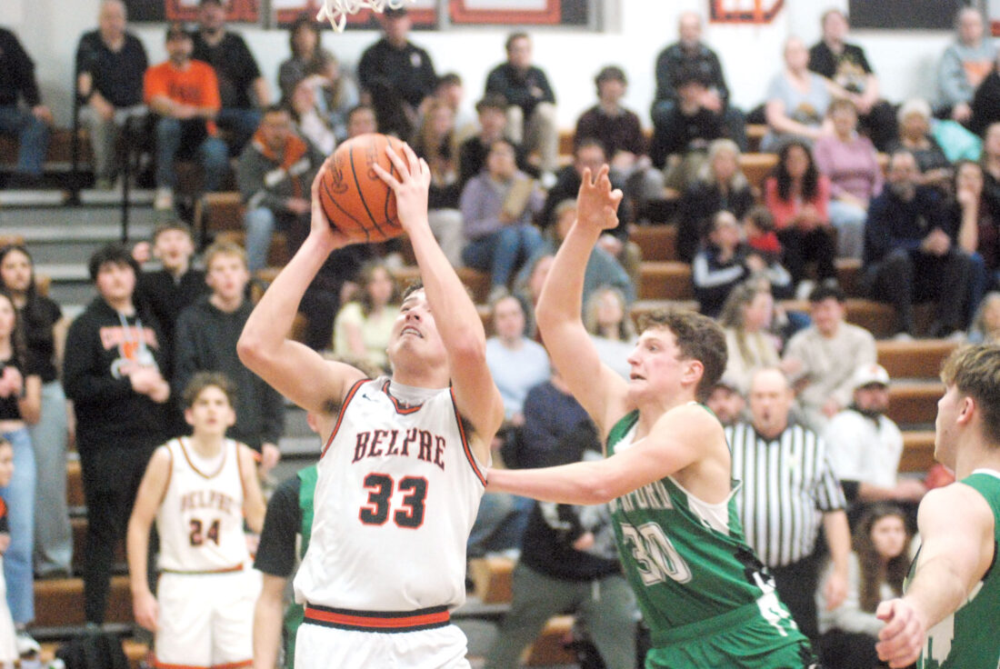 - Belpre’s Malakai Ensor (33) goes up for a basket as Waterford’s Avery Pottmeyer (30) defends during Friday’s game. (Photo by Jordan Holland)