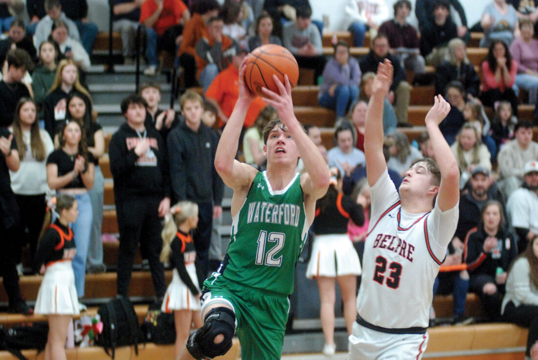 - Waterford’s Gavin Hiener (12) attacks the basket as Belpre’s Carson Woodford (23) defends during Friday’s game. (Photo by Jordan Holland)