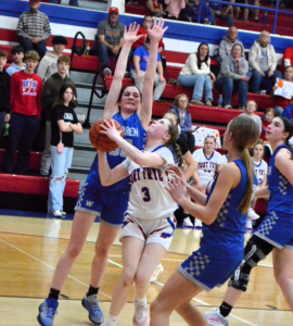 Fort Frye’s Jantzyn Huck (3) goes up for a basket as Warren’s Danica Gates (30) defends during Wednesday’s game at Dan Liedtke Court. (Photo by Mike Morrison)