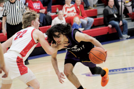 - Wood County Christian’s Asher Fenton, right, tried to dribble away from Fort Frye defender Grady Hesson during Friday’s OVAC consolation game at Fort Frye High School. (Photo by Kerry Patrick)