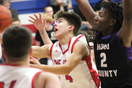 - Fort Frye’s Kainan Bradford (24) gets trapped along the baseline by Wood County Christian’s Jadon Blackwell during Friday’s OVAC consolation game at Fort Frye High School. (Photo by Kerry Patrick)