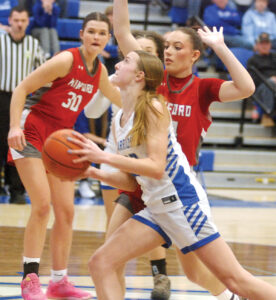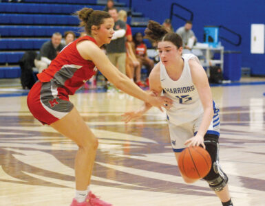 - Warren’s Juliana Huffman attacks the basket as Minford’s Riley Kasee defends during Saturday’s game at Warrior Coliseum. (Photo by Jordan Holland)