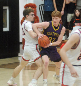 - Belpre’s Haiden Tabler, left, guards Southern’s Reed Brinager during Friday’s game at Joe Garrett Court. (Photo by Jordan Holland)