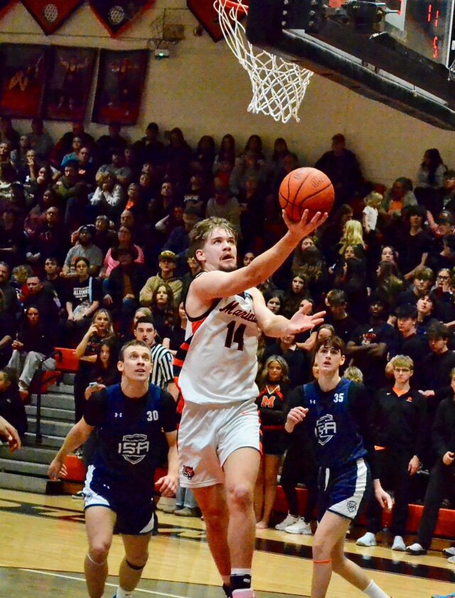 - Marietta’s Owen Riley (14) goes up for a basket during Friday’s game against International Sports Academy. (Photo by Jordan Holland)