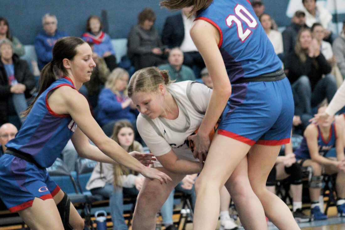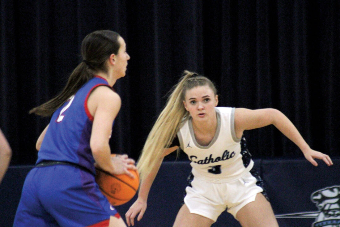 - Parkersburg Catholic’s Annie Tokodi-Ruth (3) guards Gilmer County’s Lena Frymier during Thursday’s game in Parkersburg. (Photo by Kerry Patrick)